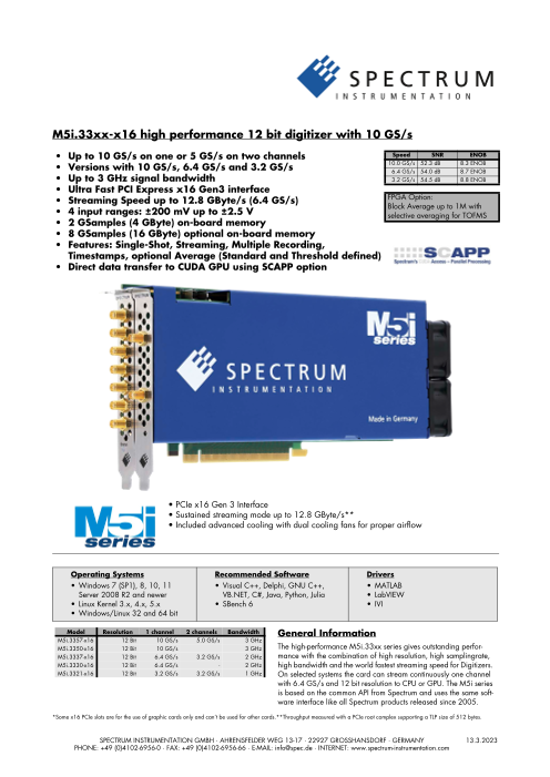カード概略仕様PCIe x16 Gen3 1 Channel 2 Channels BandwidthM5i.3337-x16 6.4 GS/s 3.2 GS/s 2 GHzM5i.3330-x16 6.4 GS/s --- ...