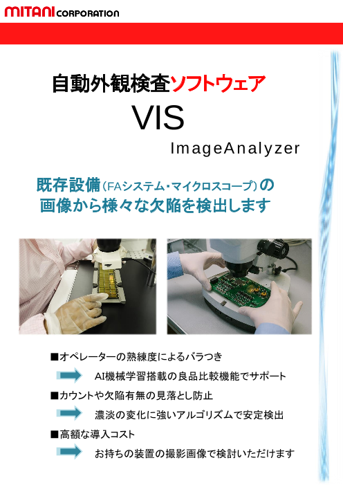 自動外観検査ソフトウェア VISは既存設備(FAシステム・マイクロスコープ)の画像からソフトウェアだけで様々な欠陥を検出します。お手持ちの顕微鏡やマイクロスコープへ自動...