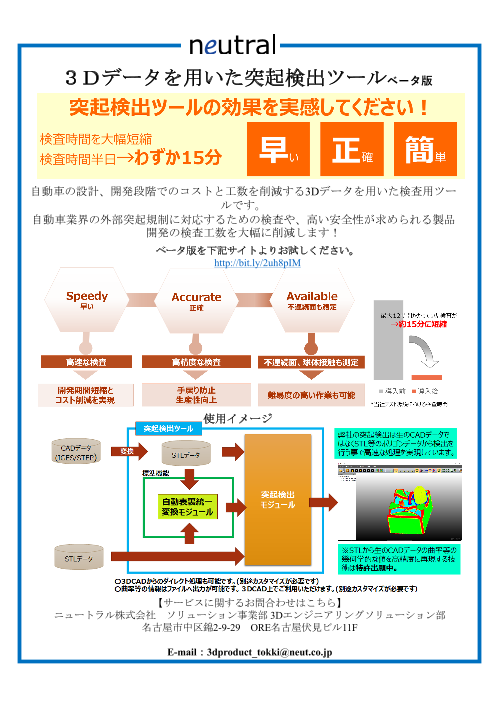 検査時間を大幅短縮 検査時間半日→わずか15分自動車の設計、開発段階でのコストと工数を削減する3Dデータを用いた検査用ツールです。自動車業界の外部突起規制に対応するため...