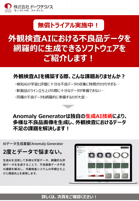 外観検査AIを構築する際に、こんな課題はありませんか? ・検知AIの学習と評価に⼗分な不良データの収集に時間がかかりすぎる ・新製品のライン立ち上げの際に十分なデー...