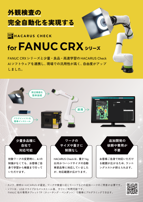 ファナック社の協働ロボットCRXシリーズに、少量・良品・高速学習のHACARUS Check AIソフトウェアを連携。サイズの大きいワークの全面検査にも対応でき、少量多品種への展開も自...