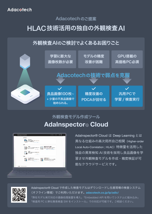 ◆素材作成から運用までの全行程に対応◆6つのパラメータからAIモデルを作成◆検証結果を画像とレポートで出力◆運用モードで作成モデルを即時利用可能◆他システムと連携可...