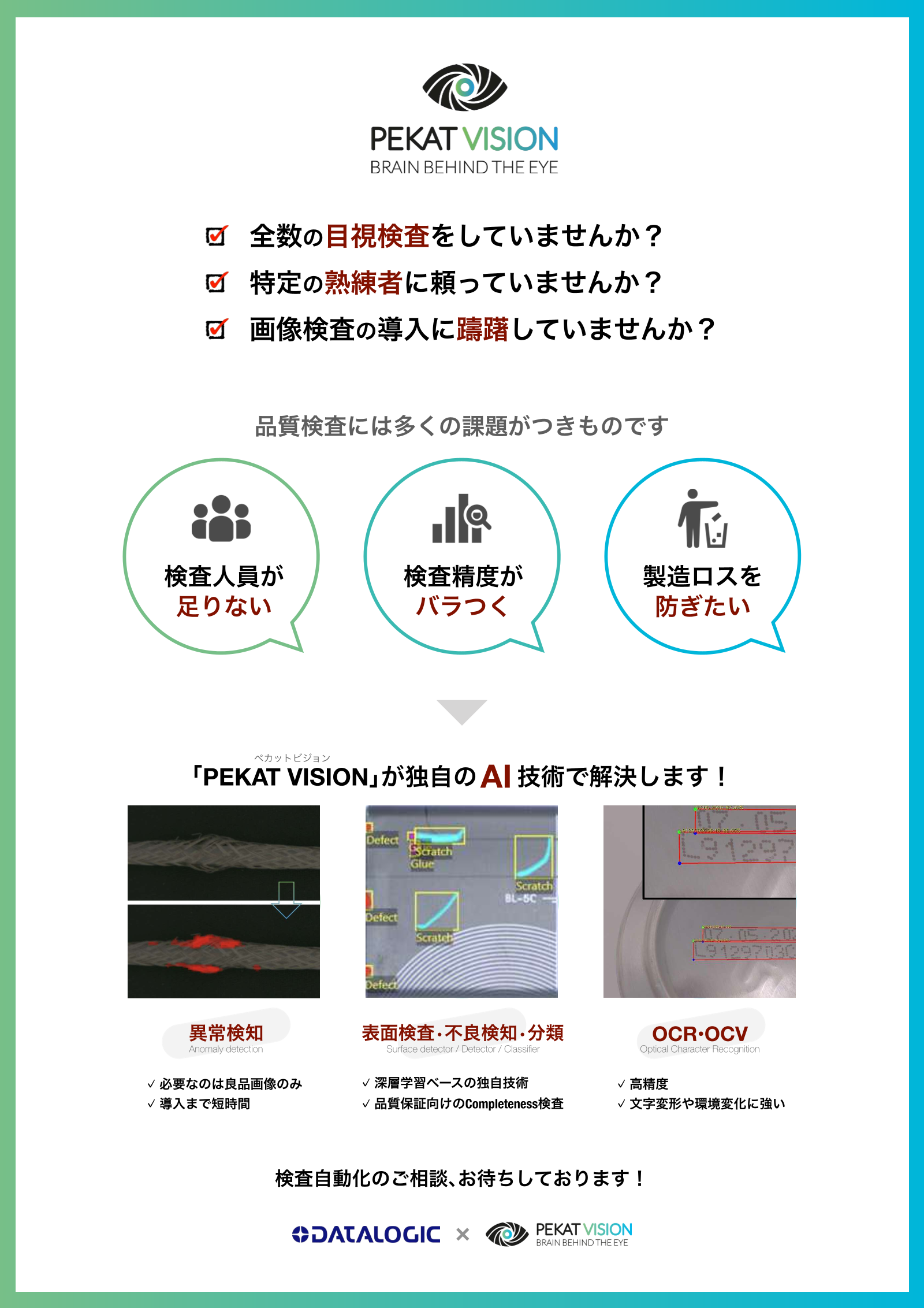 掲載内容・いま、このような課題はありませんか?・品質検査の現場の課題・PEKAT VISIONができること・私たちのAIでできること・対象物の一例・なぜPEKAT VISION?...