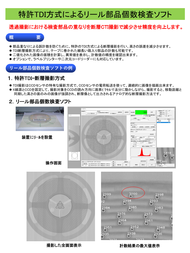 ・部品重なりによる誤計数を防ぐために、特許のTDI方式による断層撮影を行い、高さの誤差を減少させます。・TDI断層撮影方式により、テープに巻かれた細長い箱入り部品の計数...