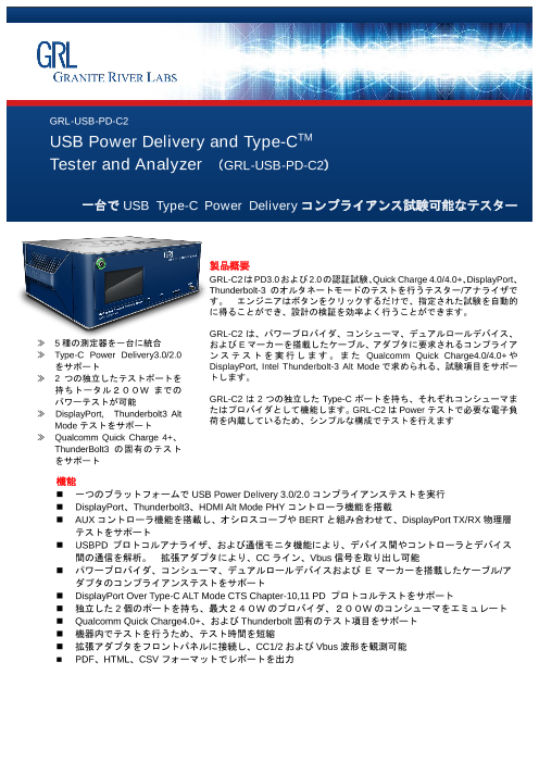 「GRL-USB-PD-C2」は、最新のUSB PD 3.1あるいは、EPRのプロトコルと、PD3.0および2.0の認証試験、Quick Charge 5.0/4.0/4.0+、DisplayPort、 Thunderbolt-3 のオルタネートモー...