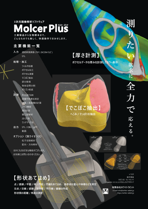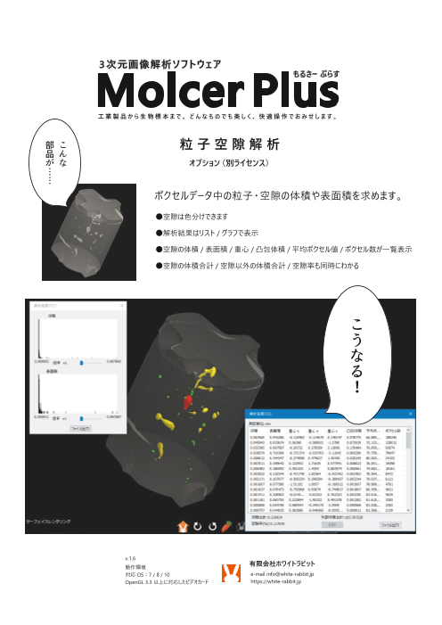 ボクセルデータ中の粒子・空隙の体積や表面積を求めます。空隙は色分けできます解析結果はリスト / グラフで表示空隙の体積 / 表面積 / 重心 / 凸包体積 / 平均ボクセル...