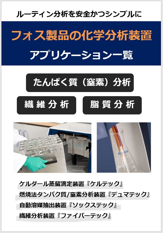 フォス・ジャパンの化学分析ソリューション食品、農産物、飼料、工業製品などを対象にした幅広い分析ソリューションを提供しています。具体的には、窒素/たんぱく質、脂肪(酸...