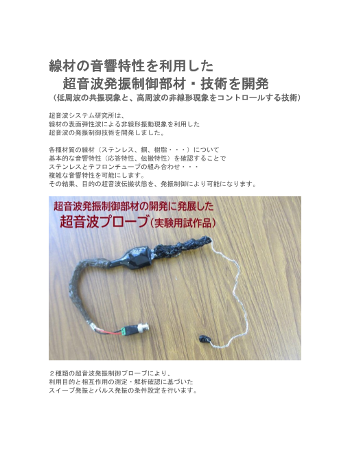 超音波システム研究所は、線材の表面弾性波による非線形振動現象を利用した超音波の発振制御技術を開発しました。各種材質の線材(ステンレス、銅、樹脂・・・)につい...