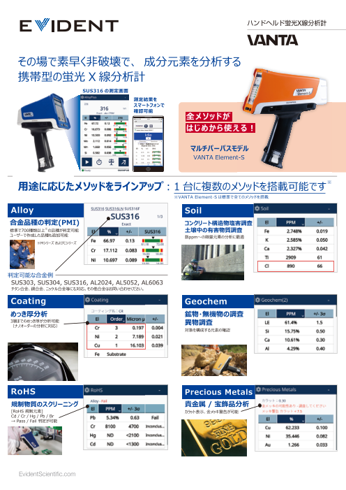 【用途に応じたメソッドをラインアップ】 1台に複数のメソッドを搭載可能です◆合金品種の判定(PMI) 標準で700種類以上の品種が判定可能 ユーザーで作成した品種も追加...