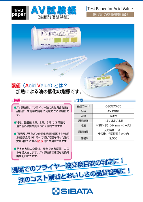 AV試験紙は“フライヤー油の劣化具合を表す酸価値”を現場で簡単に測定できる試験紙です。◆判定は酸価値1.5、2.5、3.5の3段階で、油の色の影響を受けづらく測定で...