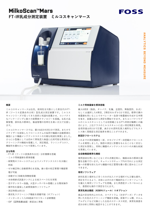 自動標準化機能(特許)をはじめ、連続40回のマルチサブサンプリング測定を実現したダブルシリンジシステムや、技術仕様などについて掲載。原料乳の品質検査、乳成分の...