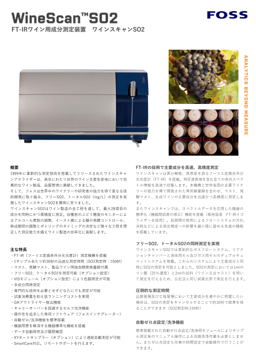 『ワインスキャンSO2』は、ブドウの収穫時からボトリングまでの全てのプロセスでご利用いただける先端のFT-IR成分分析装置です。収穫前のぶどう糖度のモニターによるアル...