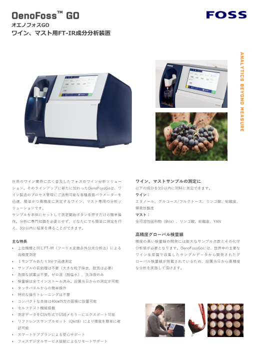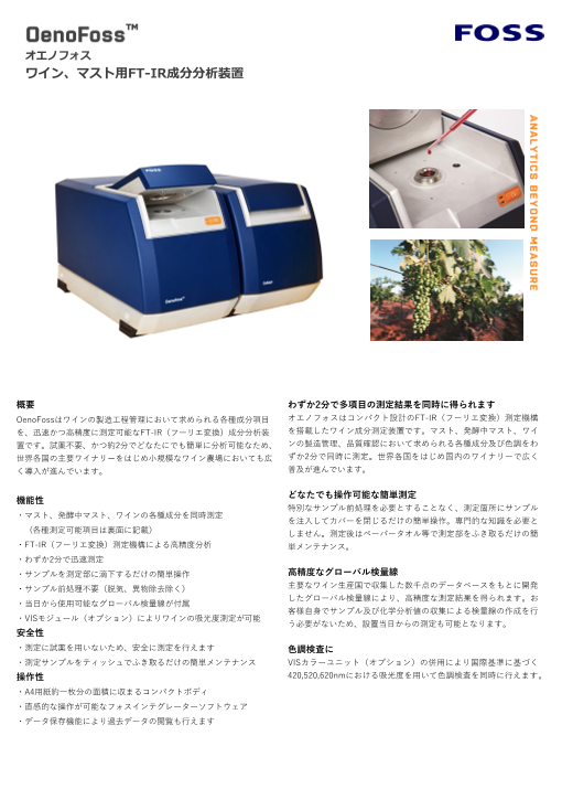 【掲載内容】・FT-IRワイン用成分分析装置 WineScan(TM) ワインスキャン・FT-IRワイン用成分測定装置 OenoFoss(TM) オエノフォス FT-IRユニット OenoFoss(TM) オ...