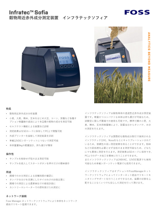 『インフラテックNOVAグレインアナライザー』は、透過光型近赤外分光法により未粉砕穀物の各種成分を高精度に測定します。可視光領域を含めた400-1100nmの低波長域を使用...