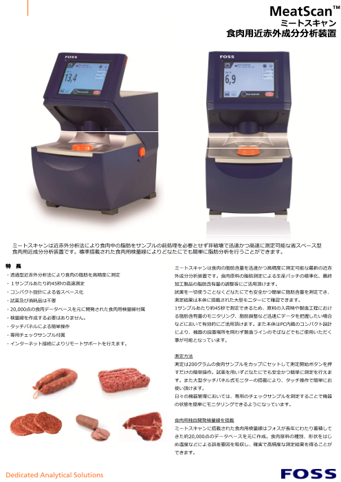 『ミートスキャン』は、近赤外分析法により食肉中の脂肪をサンプルの前処理を必要とせず非破壊で迅速かつ高速に測定可能な省スペース型食肉用近成分分析装置です。標準...