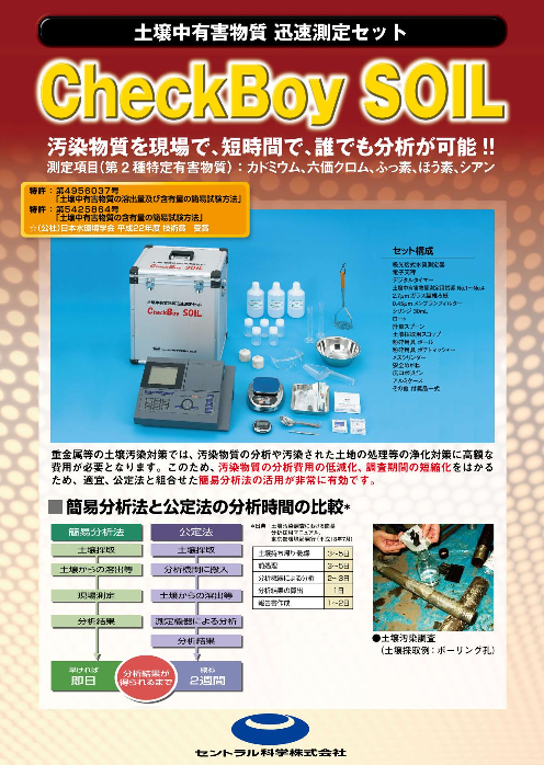CheckBoy SOILは、前処理キットと測定器で構成されたセット品であり、公定法で約2週間かかる土壌汚染物質の分析をを現場で簡単に、その日の内に行うことができます。測定項目...