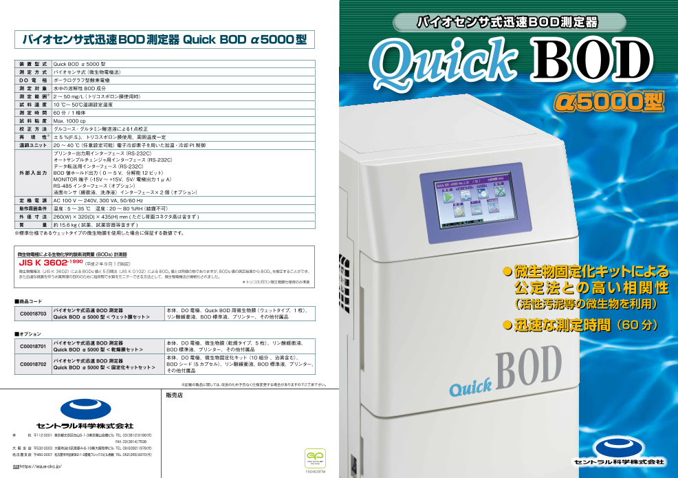 Quick BODα5000型は高精度の液送、温調、検出機能を備えたBOD測定用バイオセンサ式(微生物電極法)BOD測定器です。一般的には BOD(生物化学的酸素消費量)は、測定に5日間を...