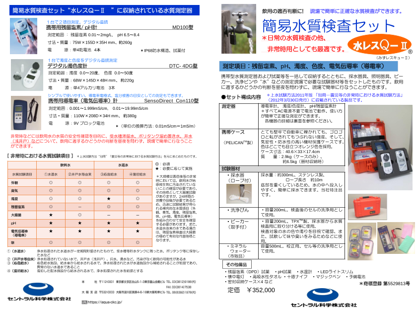 飲用の適合判断として現場で簡単に正確な水質検査ができます。日常の水質検査の他、非常時用としても最適です。非常時などには飲用水の水質の安全性確認を目的に、受水槽滞留...