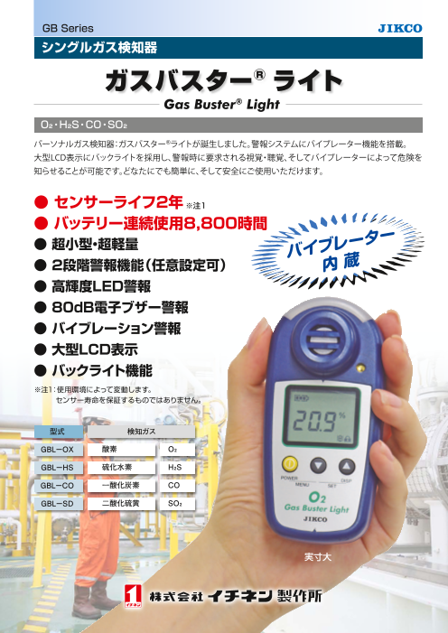 ガスバスターライトは、酸欠、有毒ガスの安全管理用として数多くの現場でお使いいただける超小型、超軽量シングルガス検知器です。警報システムにバイブレータ機能を搭載。...