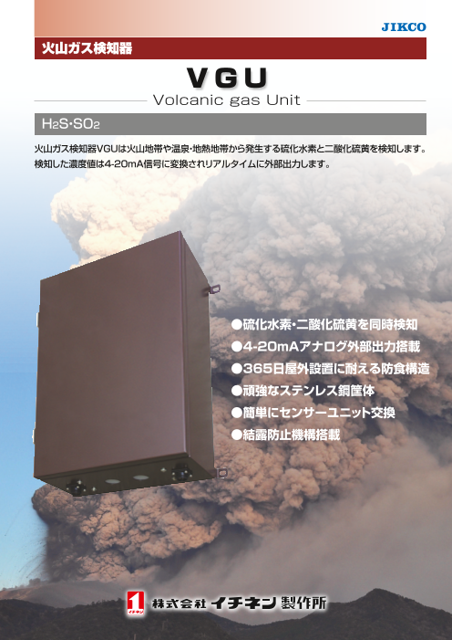 火山ガス検知器VGU-01は火山地帯や温泉・地熱地帯などから発生する硫化水素と二酸化硫黄を検知し濃度指示値を4-20mAアナログ電流により外部出力するガス検知器です。硫化水...