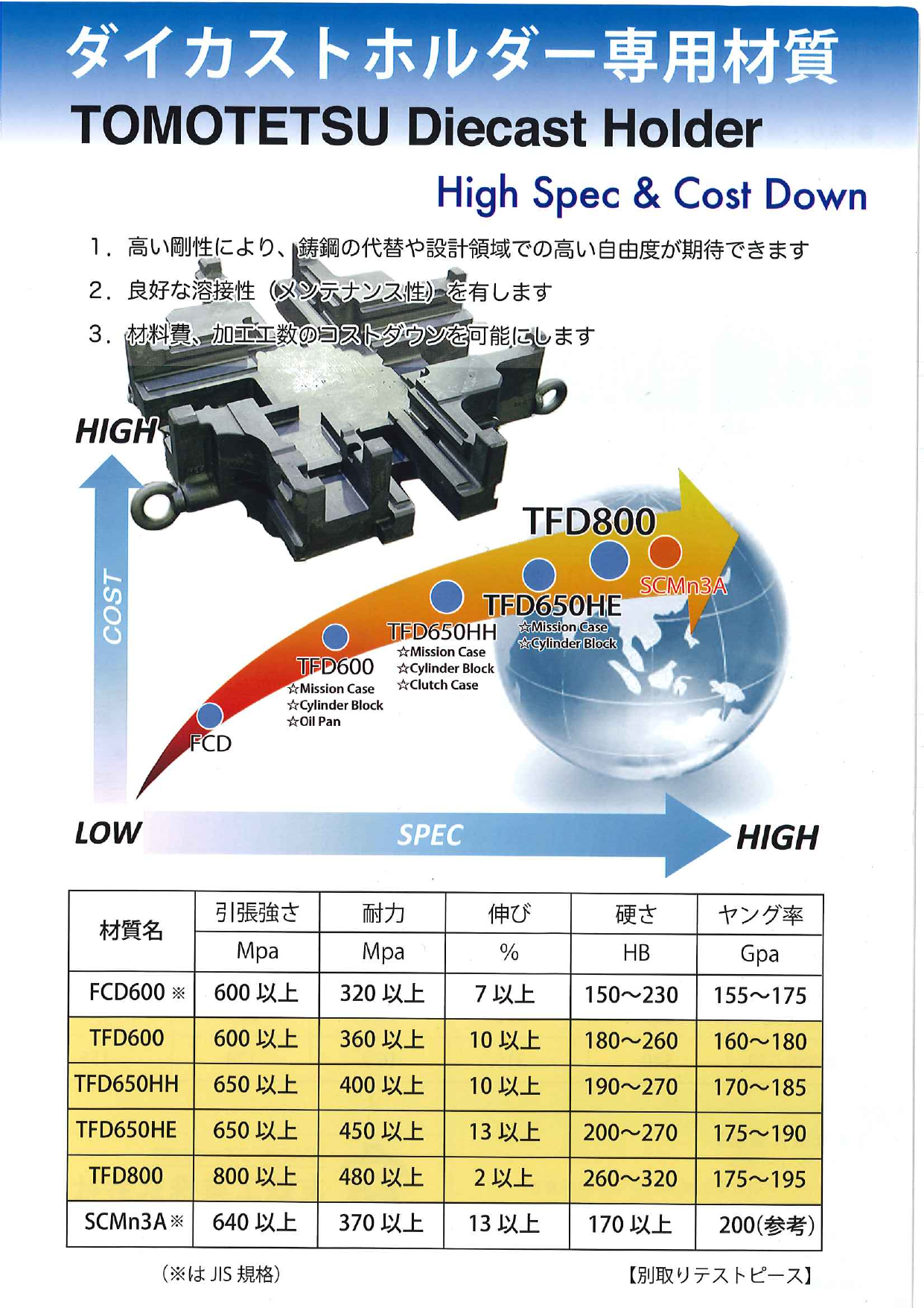 1.高い剛性により、鋳鋼の代替や設計領域での高い自由度が期待できます2.良好な溶接性(メンテナンス性)を有します3.材料費、加工工数のコストダウンを可能にします・TFDシ...