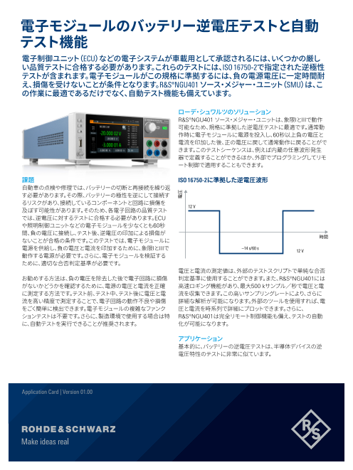 確度が高く、過渡応答時間の短いR&S®NGL200 直流電源は、困難なアプリケーションに最適です。2象限アーキテクチャーの採用により、バッテリーと負荷をシミュレートする際、ソー...