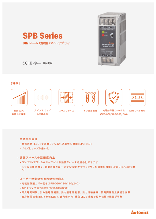 高効率を実現・共振回路(LLC)で最大92%高い効率性を保証(SPB-240)・ノイズとリップルを最小化設置スペースの活用度向上・コンパクトでスリムなサイズにより設置スペー...