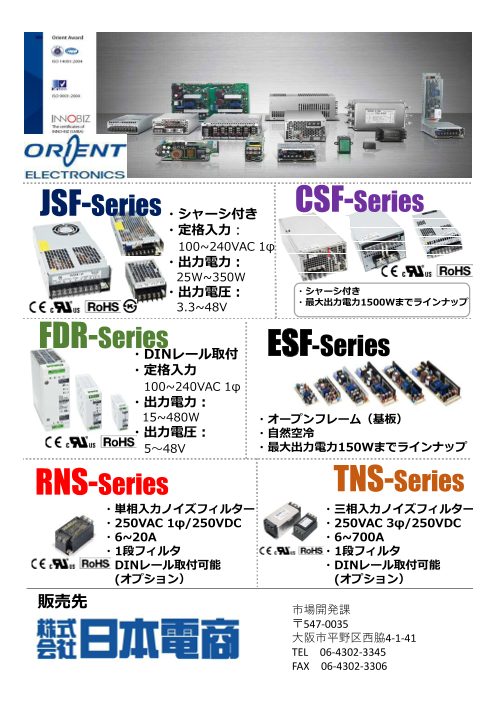 JSFシリーズシャーシ付き定格入力 100~240VAC1φ出力電力 :25W-350W出力電圧 :3.3~48VCE cRUus RoHS FDRシリーズDINレール取付け定格入力 100...
