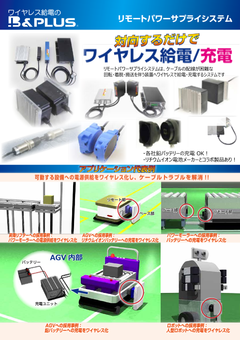 AGV(自動搬送車)・搬送ロボットなどに多数採用のワイヤレス充電システム「24時間バッテリー交換不要の自動充電が可能に!」120W~1KWの幅広い充電帯に対応の豊富なライン...