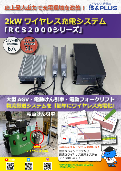 AGV(自動搬送車)・搬送ロボットなどに多数採用のワイヤレス充電システムに史上最大出力の2KW新登場!大型AGV,電動牽引車、電動フォークリフト等の大型物流搬送...