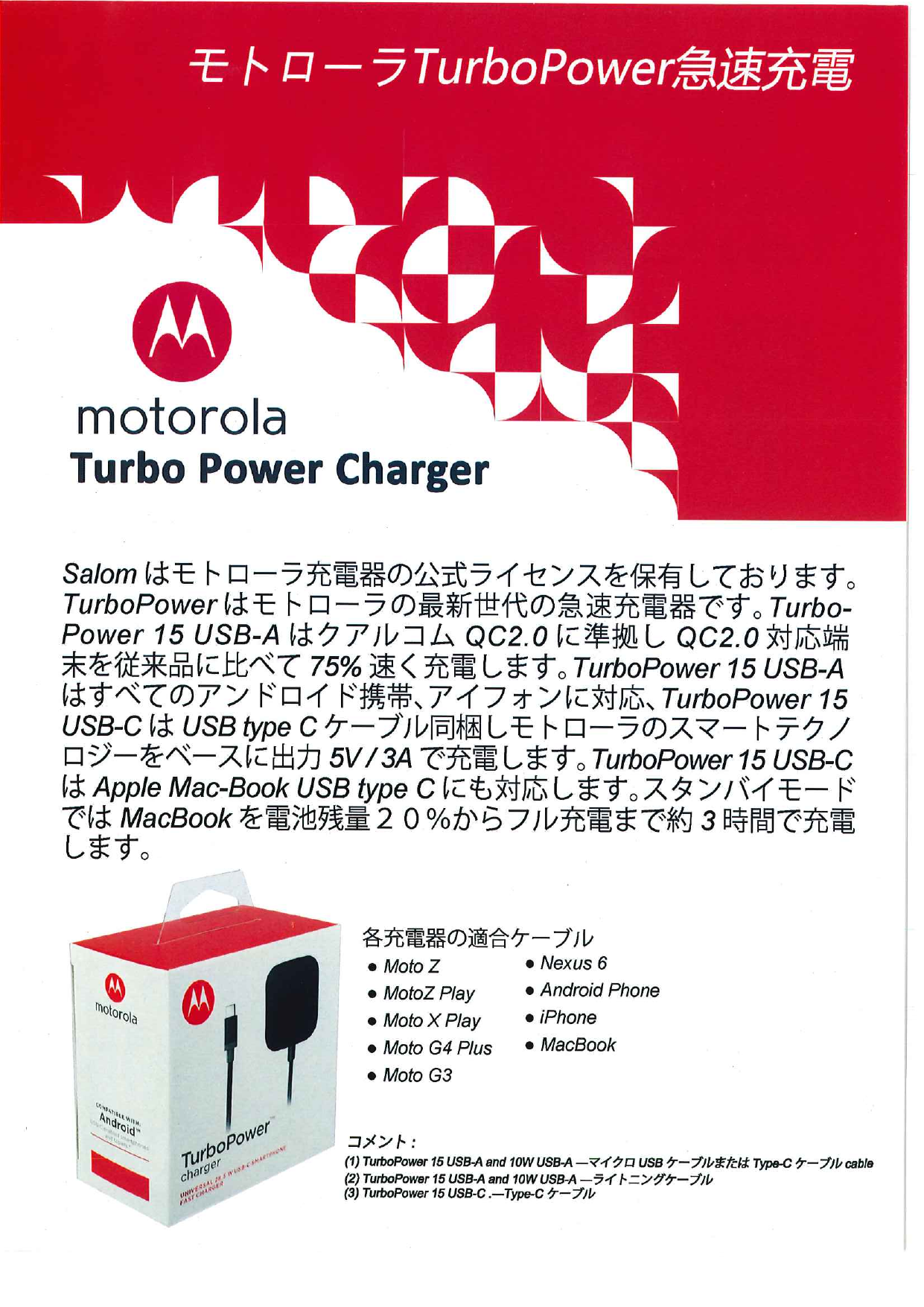Salomはモトローラ充電器の公式ライセンスを保有しております。TurboPowerはモトローラの最新世代の急速充電器です。TurboPower 15 USB-AはクアルコムQC2.0に準拠し、QC2.0...
