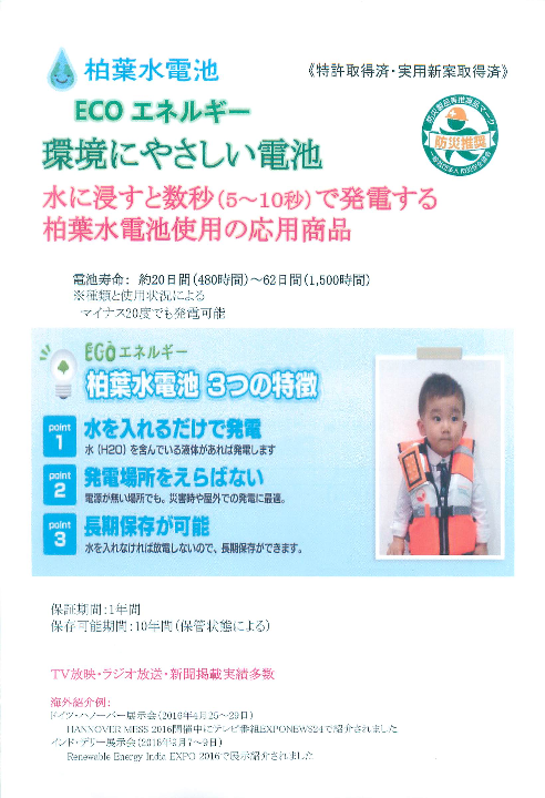 柏葉水電池 3つの特徴1.水を入れるだけで発電2.発電場所をえらばない3.長期保存が可能応用商品例・河川増水警告灯・浸水感知無線システム・スマホ充電池など...