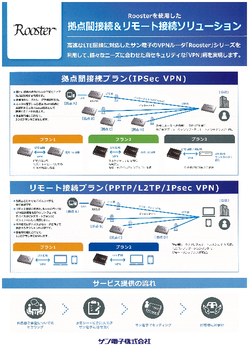 拠点と遠隔地・社外ユーザー(出張者など)をルータで繋ぐことで拠点間接続・リモート接続を実現できるパッケージプランです。高速なLTE回線に対応したサン電子のVPNルータ「R...