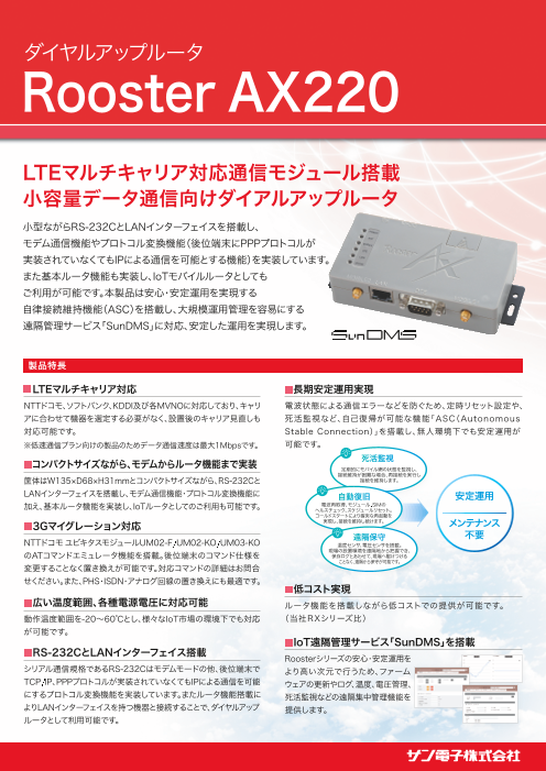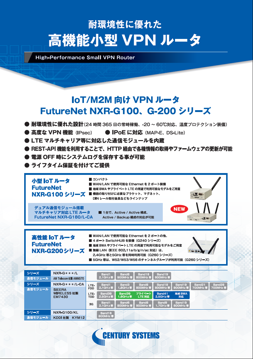 LTEマルチキャリア対応無人環境でも安定運用が可能な自律接続維持機能を搭載し、基本ルータ機能に加え、フレッツ光などの有線接続や、VPN機能に対応したIoT/M2Mルータです。
