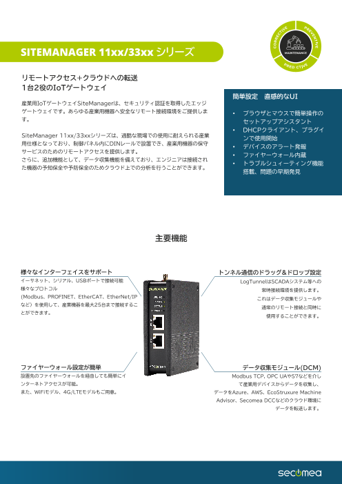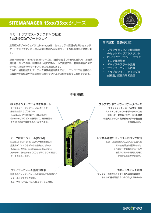 産業用IoTゲートウェイSiteManagerは、セキュリティ認証を取得したエッジ ゲートウェイです。あらゆる産業用機器へ安全なリモート接続環境をご提供しま す。SiteMan...