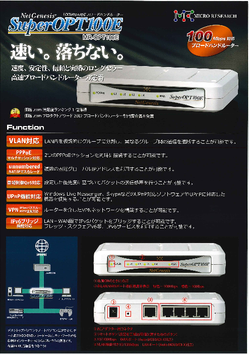 ◆FTPによる実測94Mbps、SmartBits2000による測定では最大98Mbpsの高スループットを実現しました。◆IPアドレス変換(IPマスカレード)機能により、LAN内の複数台のPCから同時に...