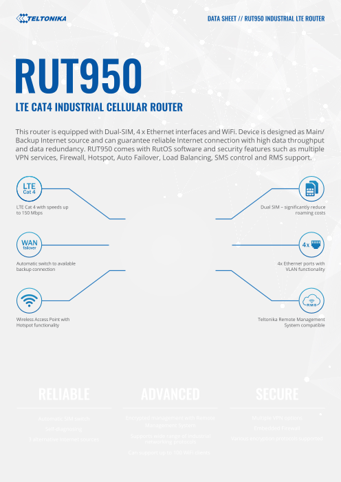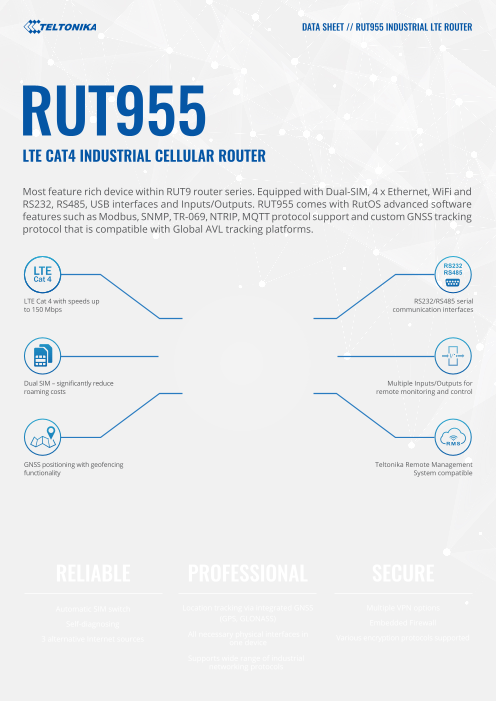 RUT955は、プロフェッショナルアプリケーション向けのI / O、GNSS、RS232 / RS485を備えた、信頼性が高く安全な4G / LTEルーターです。このデバイスは、高性能でミッションク...