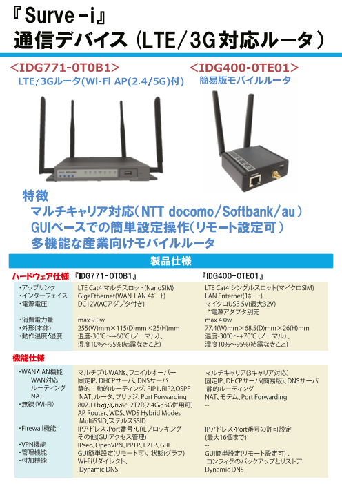 <IDG771-0TOB1> LTE/3Gルータ(Wi-Fi AP (2.4/5G)付)<IDG400-0TE01> 簡易版モバイルルータ◆マルチキャリア対応 (NTT docomo/Softbank/au) ◆GUIベースでの簡単設定操作(リ...