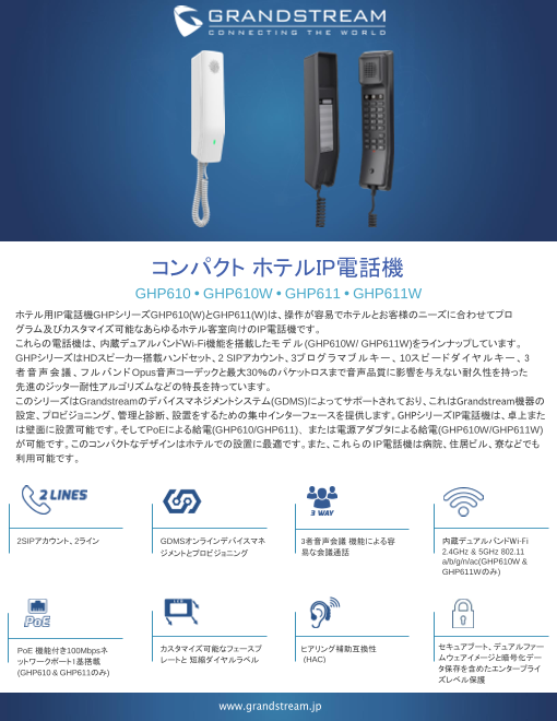 内蔵デュアルバンドWi-Fi機能を搭載したモデル(GHP610W/ GHP611W)をラインナップしています。GHPシリーズはHDスピーカー搭載ハンドセット、2 SIPアカウント、3プログ ラマブルキ...