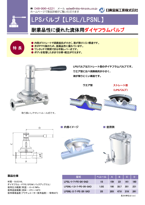 耐薬品性に優れた流体用のダイヤフラム式バルブ。取り扱いしやすいヘルール式です。 ○内部がストレートで流路抵抗が小さく、液が残りにくい構造です。○弁がPTFE製のた...
