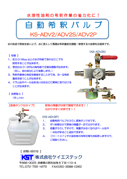 水の流速で原液を吸い上げ、水に混入して最適な希釈濃度を調整・管理する大変便利な器具です。 【特徴】◆圧力0.1Mpa以上の水が供給できればどこでも使用することが出来ま...