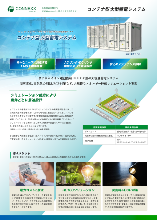●CONNEXX SYSTEMSのコンテナ型大容量産業用蓄電池はMWh規模のプロジェクトに最適なメガ蓄電システム●大規模なエネルギー貯蔵ソリューションを実現●ACリンク、DCリンク、...