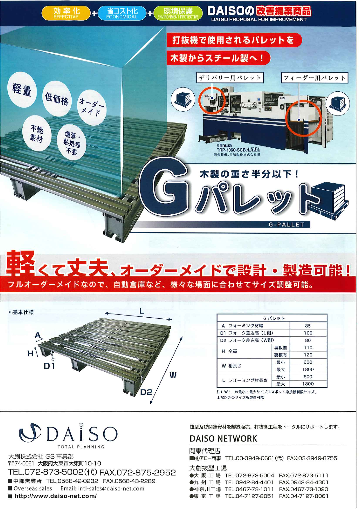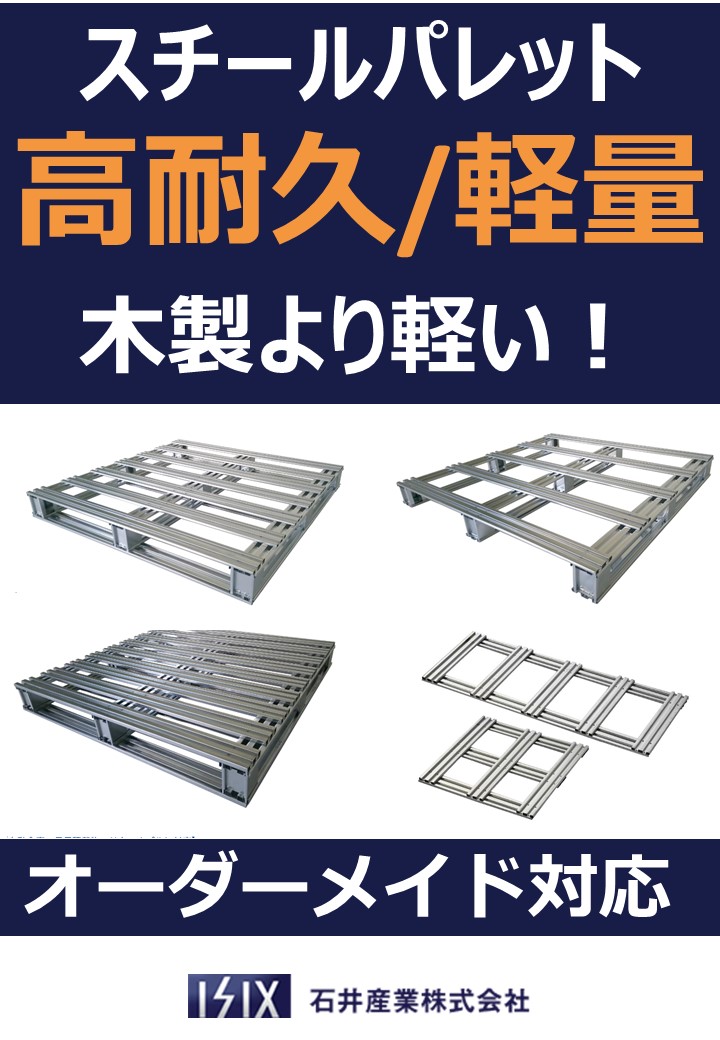 打ち抜き機で使用されるパレットを木製からスチール製へ変更、軽量化しました。燻蒸・熱処理不要、不燃素材。オーダーメイド対応可能。