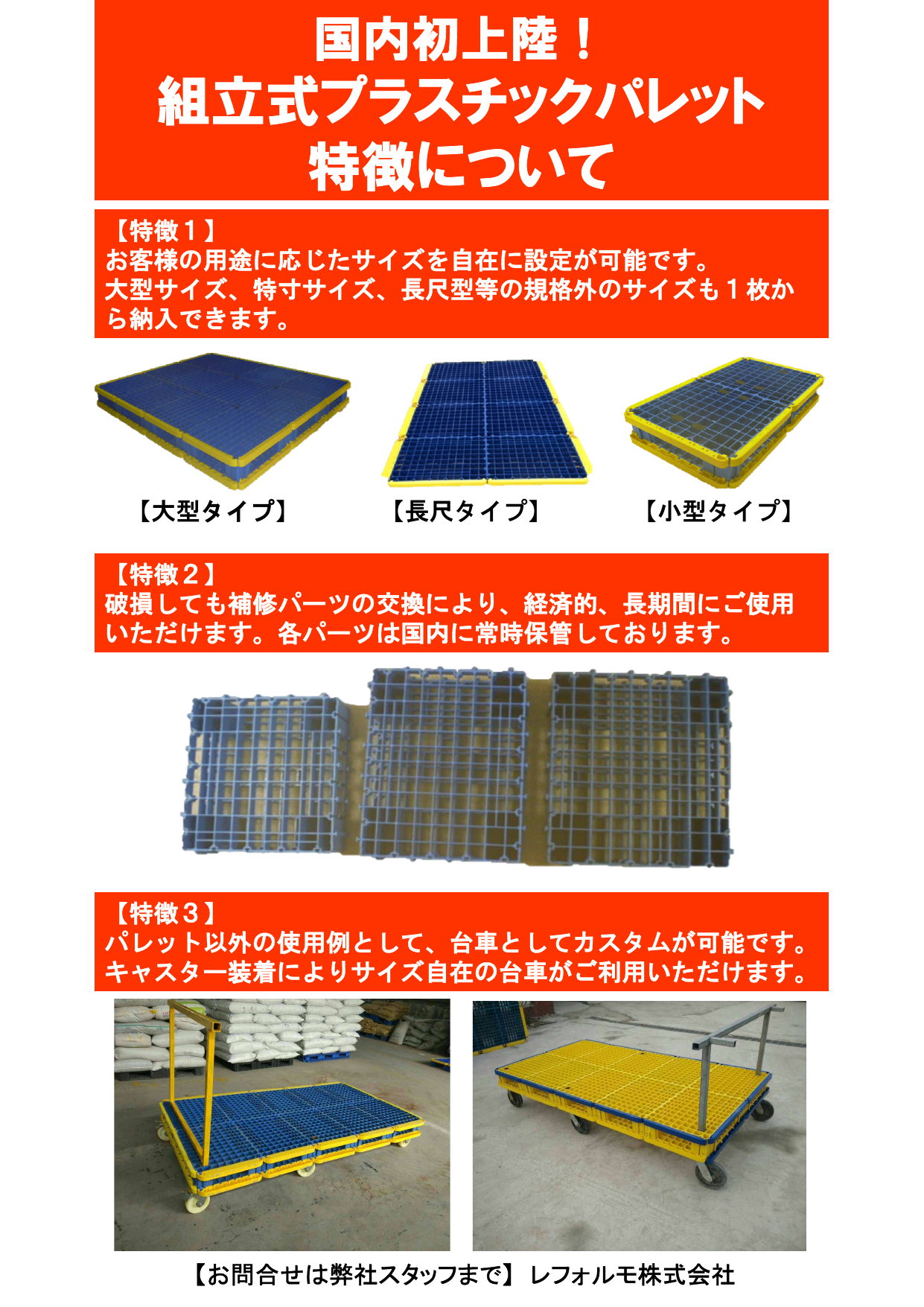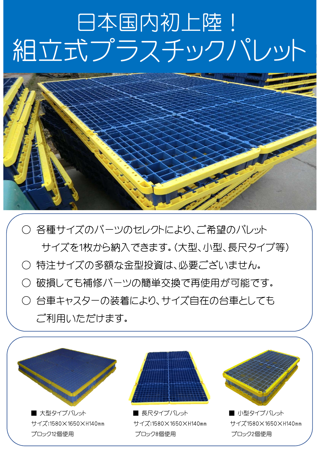 ・各種サイズのパーツのセレクトにより、ご希望のパレットサイズを1枚から納入できます。(大型、小型、長尺タイプ等)・特注サイズの多額な金型投資は、必要ございません...