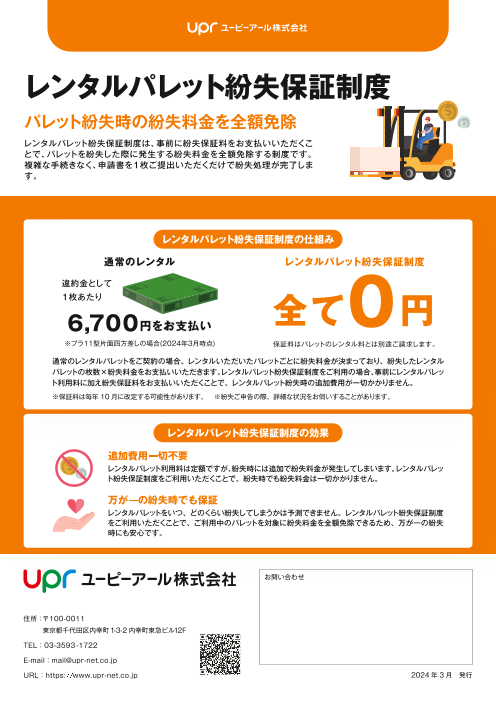 レンタルパレット紛失保証制度は、事前に紛失保証料をお支払いいただくことで、パレットを紛失した際に発生する紛失料金を全額免除する制度です。通常のレンタルパレットを...