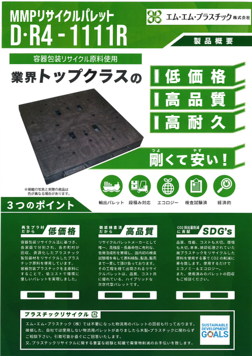 当社では、家庭から排出されるプラスチック製容器包装をリサイクルし、高品質な物流パレット(MMPパレット)を製造・販売しています。 MMPパレットは独自のサンドイッチ成型技術に...
