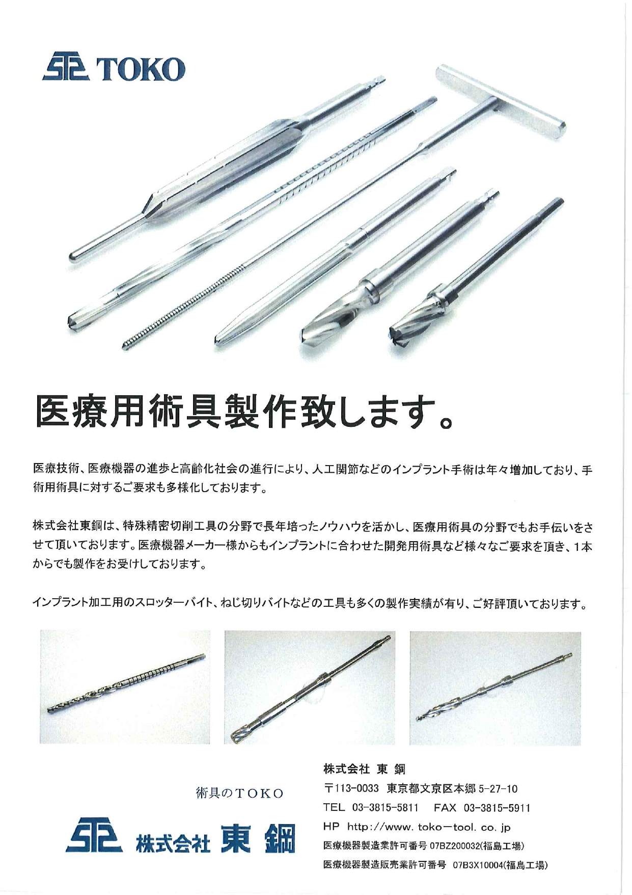 医療技術、医療機器の進歩と高齢化社会の進行により、人工関節などのインプラント手術は年々増加しており、手術用術具に対するご要求も多様化しております。株式会社東鋼は...
