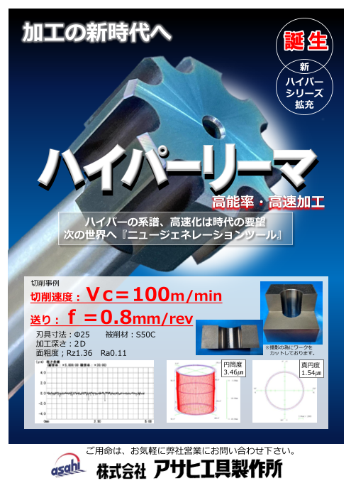 ◆切削事例切削速度:Vc=100m/min送り:f=0.8mm/rev刃具寸法:Φ25被削材:S50C加工深さ:2D面粗度;Rz1.36 Ra0.11◆詳細はカタログをダウンロードしご覧いただ...