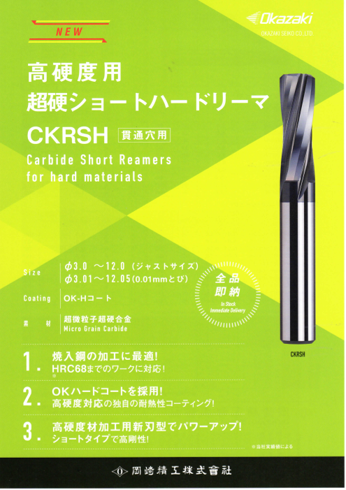 従来品のCKRH(超硬ハードリーマ)にショートタイプを追加ラインナップ致しました。ショートタイプにした為コストダウン、精度UPとなっております。加えて刃型の改良も行い従来対応硬度HRC62がHRC68までと...
