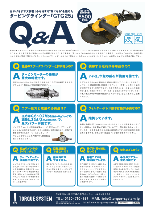 Q.普通のエアーグラインダーと何が違うの?A.タービンモーターの採用が最大の特徴です。Q.使用する砥石は専用品なの?A.いいえ、市販の砥石が使用可能です。Q.フィルター...